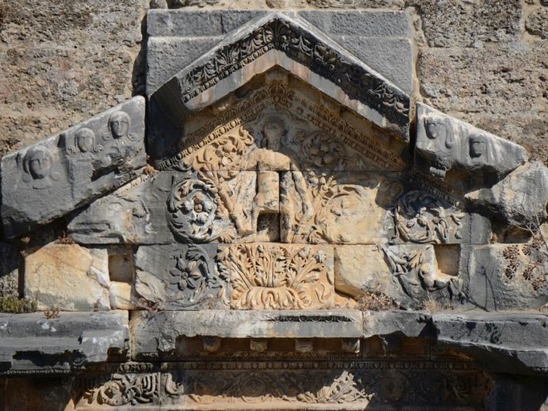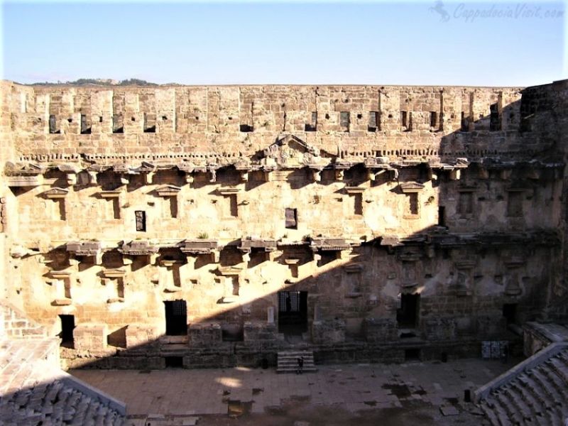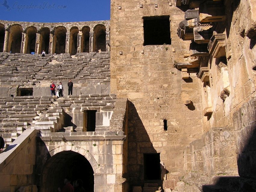 Среди всех сооружений Аспендоса наиболее притягательным и наиболее звучным является театр мастера Зенона, построенный во втором столетии нашей эры. Вместимость театра – 17 000 зрителей. Передний фасад состоит из пяти ярусов, возведенных из огромных камней с рельефными вырезами. Три большие двери с греческими и латинскими надписями на них представляют собой вход в театр. В помещение театра можно попасть через дверь на центральном фасаде, но этот фасад был построен значительно позже. Первоначально вход был через два сводчатых пассажа, расположенных с обеих сторон сцены. Королевский вход в театр наибольший и раньше имел пять дверей.