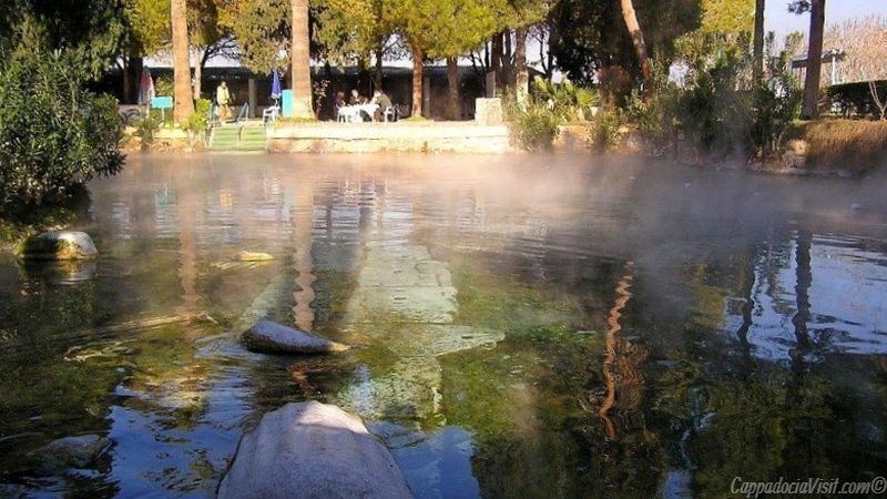 На самом деле называется этот бассейн “Античный бассейн”. В 1980-тые годы некоторые гиды начали рассказывать о том что когда-то здесь купалась царица Египта Клеопатра, которая приезжала к термальным источникам оздоравливаться и омолаживаться. Конечно купатся в бассейне в котором, купалась и сама Клеопатра делает человека счастливее, но ученые-историки и археологи не нашли даже намека на то что Клеопатра посещала когда-то города Иераполиса.