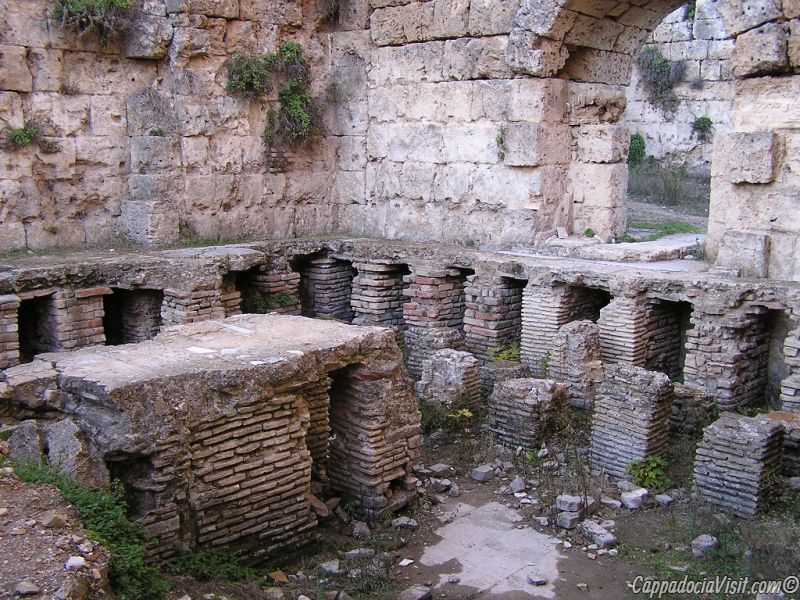 Термы свидетельствуют о богатстве жителей города в римский период и поражают размерами и роскошью. Изнутри стены залов терм были выложены мрамором, а пол мозаикой. По сути, это были не столько бани, сколько места для общения, полноценного отдыха и проведения досуга. Здесь очень хорошо видна система центрального отопления с подогревом пола и стен — гипокауст. С помощью печи нагревались вода и воздух, которые затем циркулировали под полом и в полостях стен.