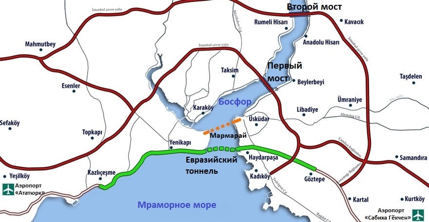 20 декабря 2016 года в Стамбуле был официально открыт Евразийский тоннель. Общая длина тоннеля составляет 5400 метров, из них 3340 метров пролегают под Босфором. Вместе с подъездными путями общая протяженность тоннеля составляет 14,6 километров, а максимальная глубина залегания — 106 метров. Тоннель предназначен для проезда легковых автомобилей и микроавтобусов.