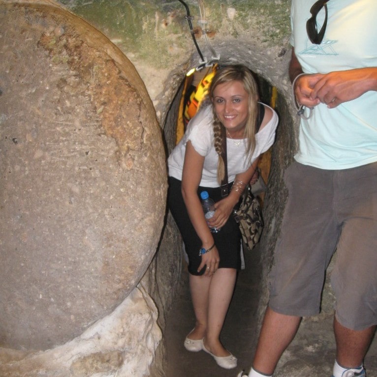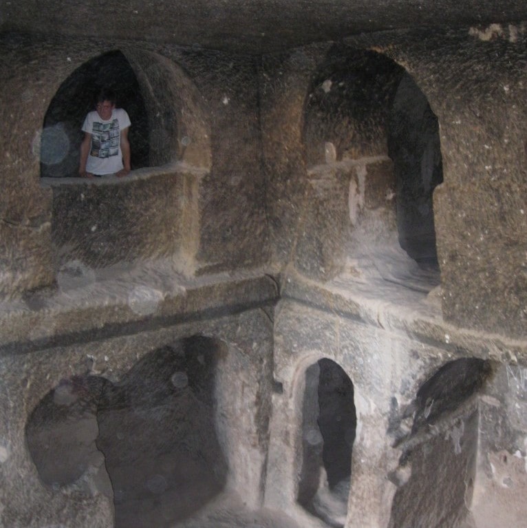 Известно об около 200 подземных городов, изучено около 30 из них. Некоторые города уходят на 20 этажей вниз. Вот в один из таких городов – Деринкую и вез нас Якуб. Деринкую – самый большой из раскопанных городов. На сегодня открыто 8 подземных этажей. Деринкую состоит из многочисленных помещений – залов, соединенных между собой коридорами и тоннелями. Узкие шахты связывают разные этажи. Температура примерно 10-12 градусов (наверху – на поверхности в тот момент уже было примерно 35 градусов). Надо отдать должное нашему гиду – он не только увлекательно рассказывал (на английском, конечно), но и никого не оставил под землей – хотя желающих побродить по подземным залам и галереям было предостаточно.